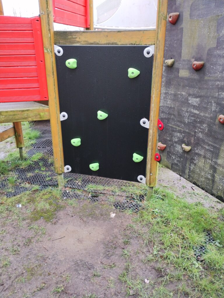 We have recently replaced the damaged climbing wall at the rear of the play tower. The colours don’t quite match (and it’s still very wet following all the recent rain), but apart from that it’s all looking good! We are